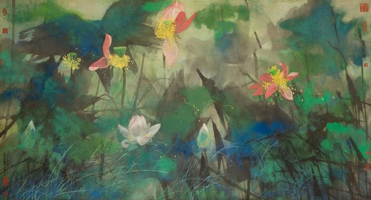 為了展現中華名族的蘇繡文化,蘇繡的作品開始進入國家政治場所,在人民大會堂有蘇繡的作品,蘇繡也不僅一次的作為外交禮品贈與國外元首。隨著香港回歸祖國,外交部駐港機構也需要裝飾布置。為了體現我國的優秀傳統文化,有關部門決定采用四大名繡之一的蘇繡作為該機構貴賓室內的陳設品。選用的畫稿是由中央工藝美術學院教授袁運甫設計的《彩墨荷塘》,這幅畫采用虛實亂針繡和平針中各種針法相結合的多種針法,既見粗獷筆墨,又有細致刻畫,精心繡制成雙面異色亂針繡《彩墨荷塘》,高1.1米。寬2.3米。原作以大膽老辣的中國傳統潑墨和西洋絢麗濃艷的色彩,描繪了一副生機黯然的荷塘景色,繡工使用了五百多種色線,真實地反映了原作的精髓,既強調了光色效果,又很好地處理了虛實搭配。繡面上粉紅色、白色的荷花亭亭玉立,金黃色花蕊中幾支嫩綠色的蓮蓬清香遠溢,碧綠的田田荷葉在深藍底色的烘托下色彩交相滲透,枝干、細草、慈姑葉有的掩映在荷葉中,有的錯落有致地呈現在荷葉叢間,富有生氣地展示了仲夏荷塘的清麗之美。這還是至今最大的雙面繡亂針作品。