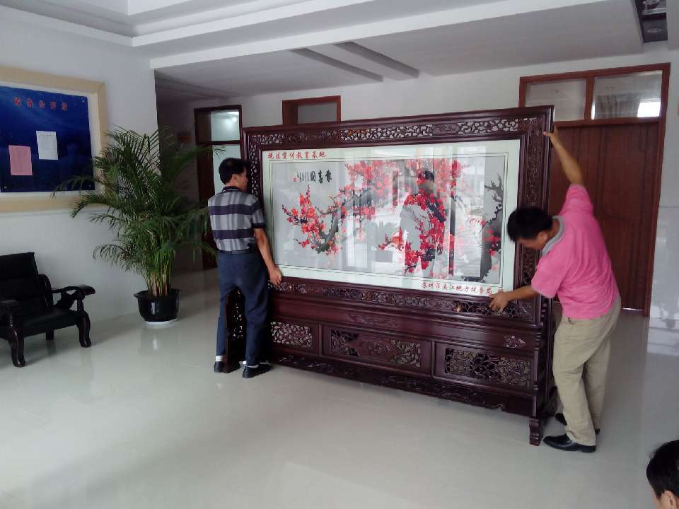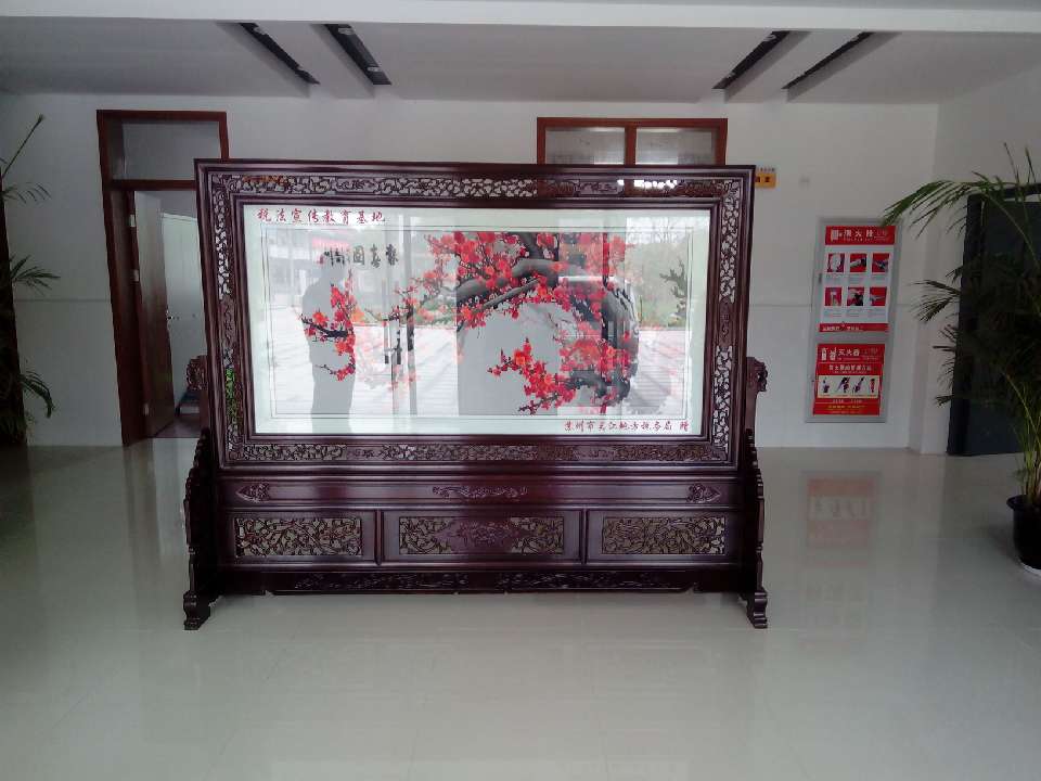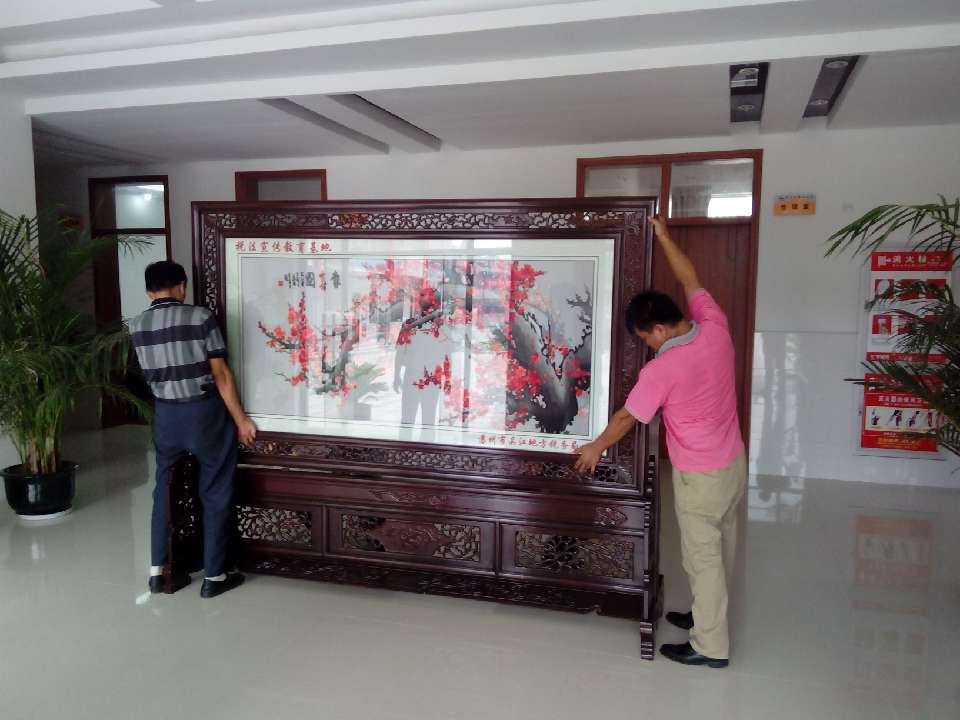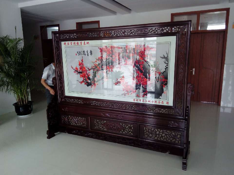 為了加強稅法教育的宣傳工作,蘇州吳江橫扇小學被設立為稅法宣傳教育基地,為此,蘇州吳江地方稅務局為了更好的普及稅法知識和積極做好宣傳工作,在蘇州嬌古蘇繡藝術品有限公司特定了一款梅花報春圖的雙面繡屏風,屏風已順利完工,現由嬌古蘇繡工作人員送抵吳江橫扇小學并進行安裝。