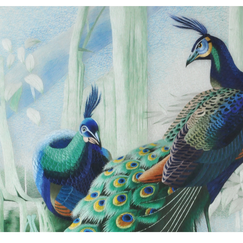 挑選蘇繡時最主要的是看蘇繡表面的光潔度,如果繡的比較稀的話,光潔度就不夠,好的繡品針線繡的很密,使圖案有立體感,光潔度高。同時從蘇繡花線的粗細也可以辨別出優劣,蘇繡中一根花線的1/2粗稱一絨,1/12粗稱一絲。劈絲即將一根花線分為若干份。蘇繡會根據不同的布質、色彩及題材,靈活綜合運針,而且花線劈絲粗細合度,從而充分表現物體形象的質感。如繡金魚魚尾,用線要細,排針要虛,才能表現輕薄、透明感。再比如繡貓,根據對象毛絲變化規律掌握絲理,繡出來的貓毛茸茸地形萬言書逼真生動,而繡的粗糙的貓毛就會象鋼針一樣扎著。