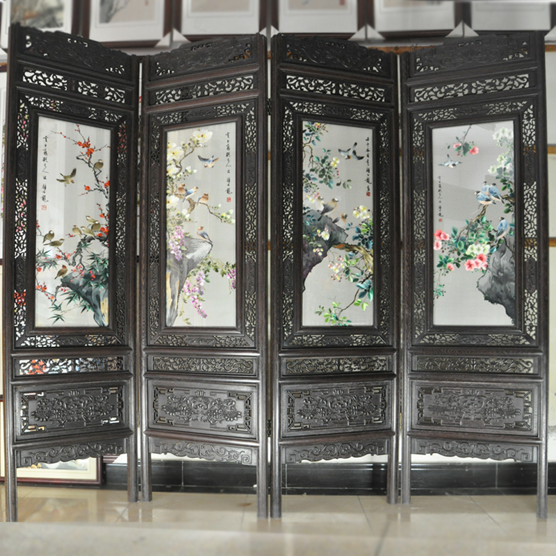 蘇繡屏風 手工刺繡 大型四扇折疊屏風 牡丹花 紅木工藝品