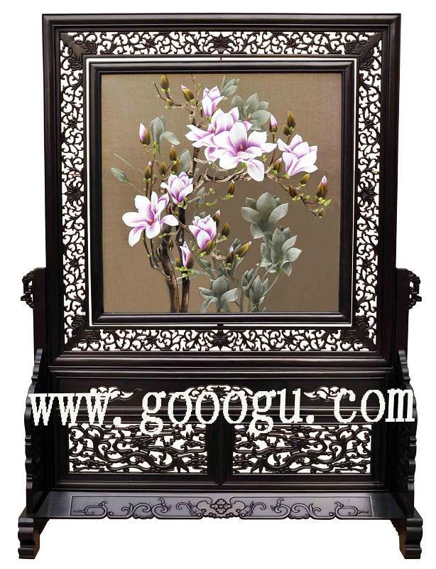 玉蘭花細節照(局部圖) 產品名稱:40X40CM紫檀蘇繡雙面繡 (作品代碼:SY-488) 產品規格:刺繡圖案尺寸 40X40CM 外框整體尺寸最寬處65CM,高85CM 產品工藝:蘇州繡娘手工刺繡。繡品圖案部分可360度旋轉 產品材質:真絲面料+桑蠶絲線+玻璃+紫檀木架 產品包裝:錦盒禮品裝 嬌古出廠價:收藏級別,限量發行,嬌古蘇繡參考價,22000元 最小起訂量:1件----廠家直銷,可當天發貨(可混配圖案) 產品描述:【40X40CM檀木雙面繡】蘇州雙面繡為蘇州刺繡工藝師純手工刺繡而成,木框材質為紫檀,整體框架花紋雕刻細膩。圖案有花卉(牡丹,梅花,荷花,蘭花等),花鳥,動物(熊貓,老虎,魚等),山水,風景,名家字畫等。圖案多達一百多種,有古色古香的,有現代氣息的,高貴典雅,是贈送客人的特色禮品之一。此款選取嬌古蘇繡資深高級工藝師歷時半年精心刺繡而成,每款題材的繡者均是專攻山水、牡丹或相關題材達數十載之久的專業技師。全國每年發行一件。歡迎收藏!