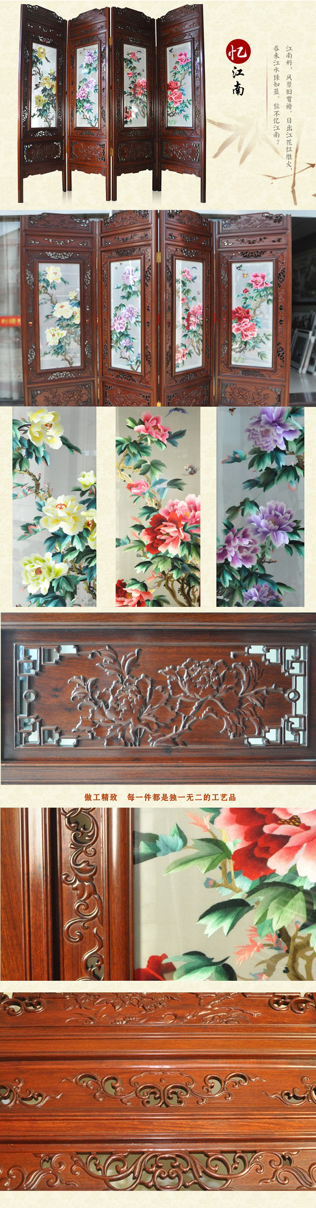 【產品名稱】:四扇牡丹屏風(雙面繡) (作品代碼:zp-1501) 【產品規格】:圖案尺寸每扇寬度35cm,高度90cm 外框整體尺寸寬60cm,高205cm 【產品工藝】:手工刺繡 【產品材質】:真絲面料+紅木+桑蠶絲線+玻璃 【產品包裝】:木箱包裝,用海綿包扎,確保運輸安全 【出廠價】:39800元 【產品運輸】:我司負責發往客戶指定地點,蘇州附近城市可送貨上門! 【產品說明】:牡丹雙面繡折疊屏風,是由蘇州工藝師耗時數個月精心手工刺繡而成,刺繡圖案以牡丹花為題材繡工精細,顏色搭配均勻過渡自然,屏風的框架選用進口的緬甸紅木為料,是蘇繡屏風中的珍稀作品。是居家和辦公的重要裝飾品之一!歡迎親臨嬌古蘇繡展示廳觀看實物!