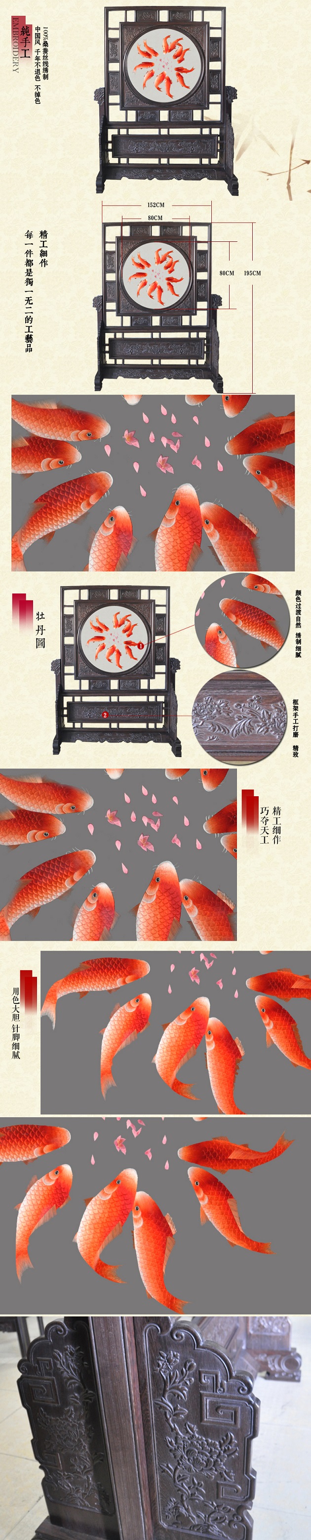 【產(chǎn)品名稱】:十二紅魚(yú)(雙面繡) (作品代碼:p-1512) 【產(chǎn)品規(guī)格】:圖案尺寸80cm的圓 外框整體尺寸寬152cm,高195cm 【產(chǎn)品工藝】:純手工刺繡 【產(chǎn)品材質(zhì)】:真絲面料+雞翅木+桑蠶絲線+玻璃 【產(chǎn)品包裝】:木箱包裝,用海綿包扎,確保運(yùn)輸安全 【出廠價(jià)】:21800元 【產(chǎn)品運(yùn)輸】:我司負(fù)責(zé)發(fā)往客戶指定地點(diǎn),蘇州附近城市可送貨上門(mén)! 【產(chǎn)品說(shuō)明】:十二紅魚(yú)雙面繡屏風(fēng),是由蘇州工藝師耗時(shí)數(shù)個(gè)月精心手工刺繡而成,刺繡圖案以傳統(tǒng)的魚(yú)為題材繡工精細(xì),簡(jiǎn)約大方,顏色搭配均勻過(guò)渡自然,屏風(fēng)的框架選用進(jìn)口的雞翅木為料,是蘇繡屏風(fēng)中的珍稀作品。是居家和辦公的裝飾品之一!歡迎親臨嬌古蘇繡展示廳觀看實(shí)物!