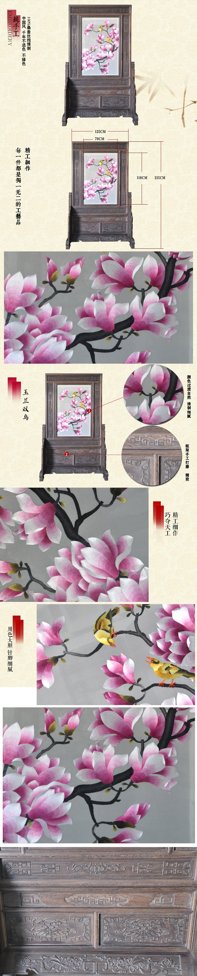 【產品名稱】:紅玉蘭花鳥(雙面繡) (作品代碼:p-1522) 【產品規格】:圖案尺寸寬70cm,高110cm 外框整體尺寸寬125cm,高215cm 【產品工藝】:手工刺繡 【產品材質】:真絲面料+雞翅木+桑蠶絲線+玻璃 【產品包裝】:木箱包裝,用海綿包扎,確保運輸安全 【出廠價】:15800元 【產品運輸】:我司負責發往客戶指定地點,蘇州附近城市可送貨上門! 【產品說明】:紅玉蘭花鳥雙面繡屏風,是由蘇州工藝師耗時數個月精心手工刺繡而成,刺繡圖案以紅玉蘭花鳥為題材繡工精細,簡約大方,顏色搭配均勻過渡自然,屏風的框架選用進口的雞翅木為料,是蘇繡屏風中的珍稀作品。是居家和辦公的裝飾品之一!歡迎親臨嬌古蘇繡展示廳觀看實物!